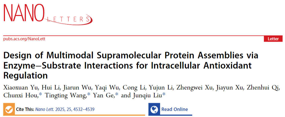 近日,jdb电子 刘俊秋教授团队在Nano letters 上发表题为“Design of Multimodal Supramolecular Protein Assemblies via Enzyme–Substrate Interactions for Intracellular Antioxidant Regulation”的学术论文。创新的设计了一种由酶 - 底物相互作用驱动的动态超分子蛋白组装体系,用于细胞内的抗氧化调控。利用经过半胱氨酸突变修饰的谷胱甘肽S - 转移酶(GSTK77C),设计了一种含有谷胱甘肽(GSH)基团和马来酰亚胺基团(通过PEG链连接)的效应分子(GMP4M)。该体系能够形成具有多样化形态的分层蛋白组装结构,包括纳米线、纳米环、纳米枝和纳米扭曲结构,并且能够通过内源性GSH实现可切换的“开/关”酶活性调节。这些组装结构在生理条件下保持结构完整性,展现出显著的可逆性,并且在稳定性和环境适应性方面优于天然的谷胱甘肽S - 转移酶(GST)。这种方法为创建可调节且多样化的蛋白组装提供了一个多功能平台,具有广泛应用于抗氧化治疗和生物医学干预的潜力。