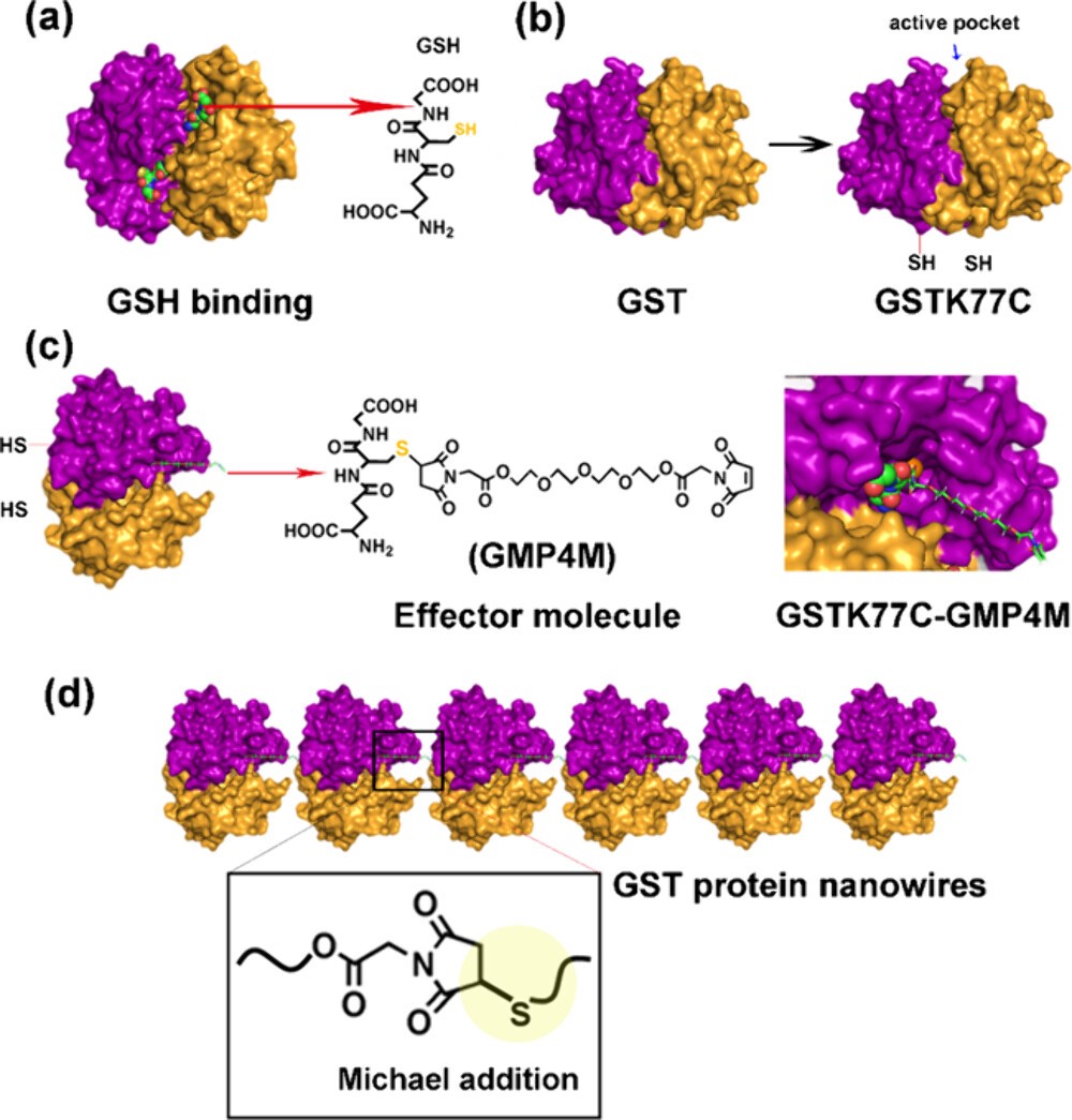 本研究详细阐述了一种基于酶 - 底物相互作用的超分子蛋白组装策略。通过将野生型谷胱甘肽S - 转移酶(GST)的第77位赖氨酸突变为半胱氨酸(GSTK77C),设计了一种效应分子GMP4M。该分子由谷胱甘肽(GSH)基团、聚乙二醇(PEG)链以及马来酰亚胺基团组成。GMP4M能够与GSTK77C发生特异性结合,从而驱动蛋白组装形成纳米线结构。