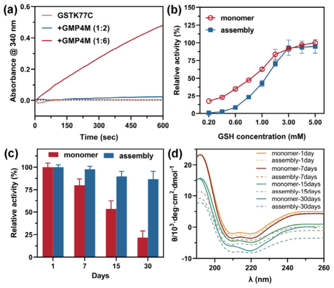 研究发现,组装体的酶活性能够依据内源性谷胱甘肽(GSH)的浓度实现“开/关”调控。当GSH浓度较低时,GMP4M会占据GST的活性口袋,致使酶活性被抑制;而当GSH浓度较高时,GSH与GMP4M竞争结合位点,促使组装体解离,进而恢复酶活性。此外,组装体在室温条件下保存30天后,仍能保持86.7%的酶活性,相比之下,GSTK77C单体的活性仅保留了21.7%。圆二色光谱(CD)检测结果显示,组装体在储存30天后仍维持其初始的二级结构,而单体的二级结构在储存15天后便开始出现变化。这些结果表明,基于酶 - 底物相互作用形成的组装体不仅展现出显著的动态可调节性,还具备出色的环境适应性和长期稳定性,为后续的生物医学应用奠定了坚实基础。