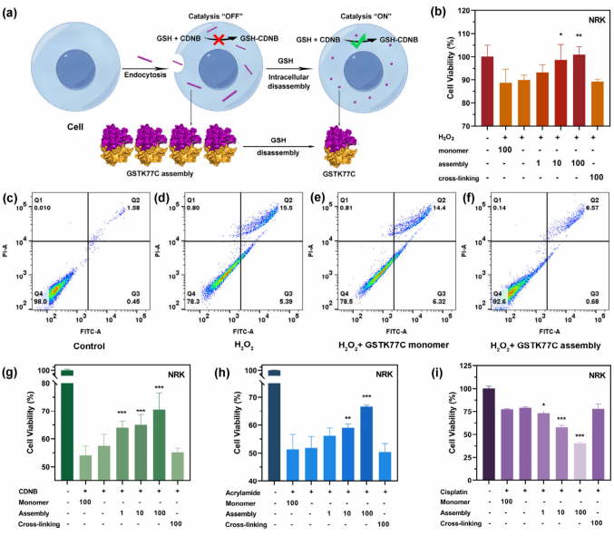 揭示了GSTK77C组装体在细胞内的抗氧化与解毒功能。研究表明,GSTK77C组装体借助内源性GSH的调控,实现酶活性的“开启”与“关闭”,进而在细胞内发挥抗氧化及解毒作用。在H₂O₂诱导的氧化损伤模型中,GSTK77C组装体显著降低了细胞凋亡率,有效保护细胞免受氧化损伤。此外,在CDNB诱导的急性毒性模型以及丙烯酰胺诱导的慢性毒性模型中,GSTK77C组装体也表现出良好的解毒效果。然而,经过戊二醛交联的GSTK77C组装体因无法解组装恢复酶活性,未能实现解毒功能。这些结果进一步证实了组装体的动态解组装过程在细胞内抗氧化和解毒功能中的关键作用,为开发新型生物医学干预策略提供了有力支持。本文的核心内容是通过酶-底物相互作用设计了一种动态超分子蛋白组装体,用于细胞内的抗氧化调节。研究团队以谷胱甘肽S转移酶为模型蛋白,通过引入半胱氨酸突变(GSTK77C),并设计效应分子GMP4M,实现了基于酶-底物相互作用的蛋白组装。该系统能够形成多种形态的纳米结构,包括纳米线、纳米环、纳米分支和纳米扭曲结构,并且其酶活性可以通过内源性谷胱甘肽进行可切换的“开/关”调控。