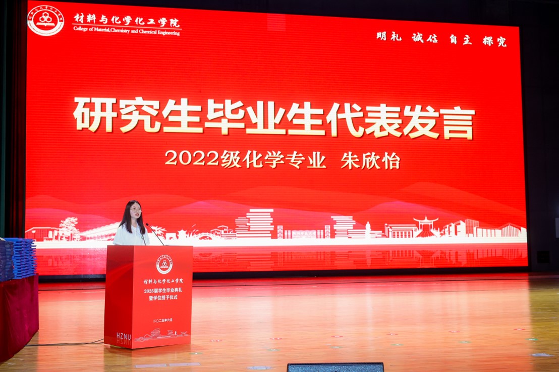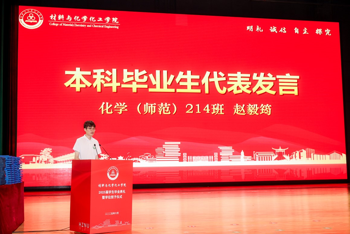 研究生毕业生代表、2022级化学专业朱欣怡,本科毕业生代表、化学(师范)214班赵毅筠分别上台发言。他们深情回顾在jdb电子 的求学时光,感恩师长的悉心教导、同学的真挚情谊;展望未来,立志以昂扬的姿态,在更广阔的天地中践行材化人的使命与担当,让青春在不懈奋斗中绽放绚丽之花。