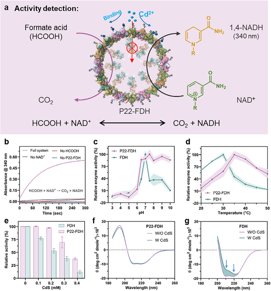 2.蛋白笼保护模块:对P22噬菌体来源的蛋白笼进行基因工程改造,使其内部封装甲酸脱氢酶,同时在外表面展示高密度的镉结合肽。该模块既能像“盔甲”一样保护酶免受恶劣环境(如金属离子、极端pH/温度)的侵害,又能作为模板引导CdS量子点的有序形成,并在物理上隔离光催化剂与酶,避免酶活性中心的损伤。