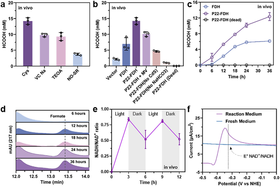 进一步构建的光催化剂-酶-活细菌生物杂化系统,利用活细菌作为光合反应器,实现了细胞内CdS QDs的生物矿化与原位光催化(图3)。该系统利用半胱氨酸作为空穴牺牲剂,在光照下实现了14.21 mM的甲酸产量,相较于无牺牲剂体系,效率提升了378.89%,并且比仅表达游离FDH的菌株产量高出204.45%,实现了6.8倍的CO2到甲酸的转化效率提升(图4)。该系统还展现出良好的循环稳定性,在三次重复使用后仍能保持78.9%的活性。