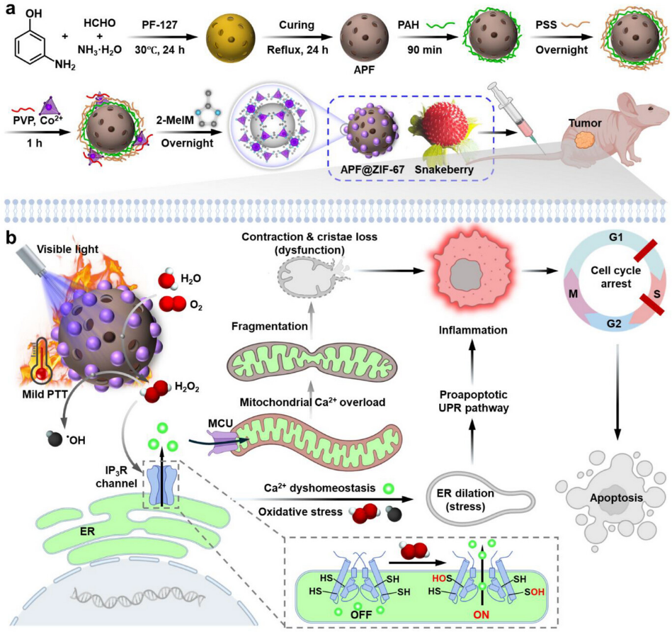 近日,我校jdb电子 祝鼎成副教授与刘俊秋教授团队在光催化抗肿瘤研究领域取得新进展,相关研究成果以题为A Snakeberry-Inspired Photocatalytic Nanoreactor Activates Endogenous Ca2+ Store for Ca2+ Overload-Mediated Cancer Therapy发表于国际知名期刊Small上(IF = 12.1)。 该工作利用仿蛇莓状多层结构纳米反应器,通过可见光催化级联生成H2O2/·OH,特异性激活IP3R钙通道诱导线粒体钙超载,实现精准高效的肿瘤清除。