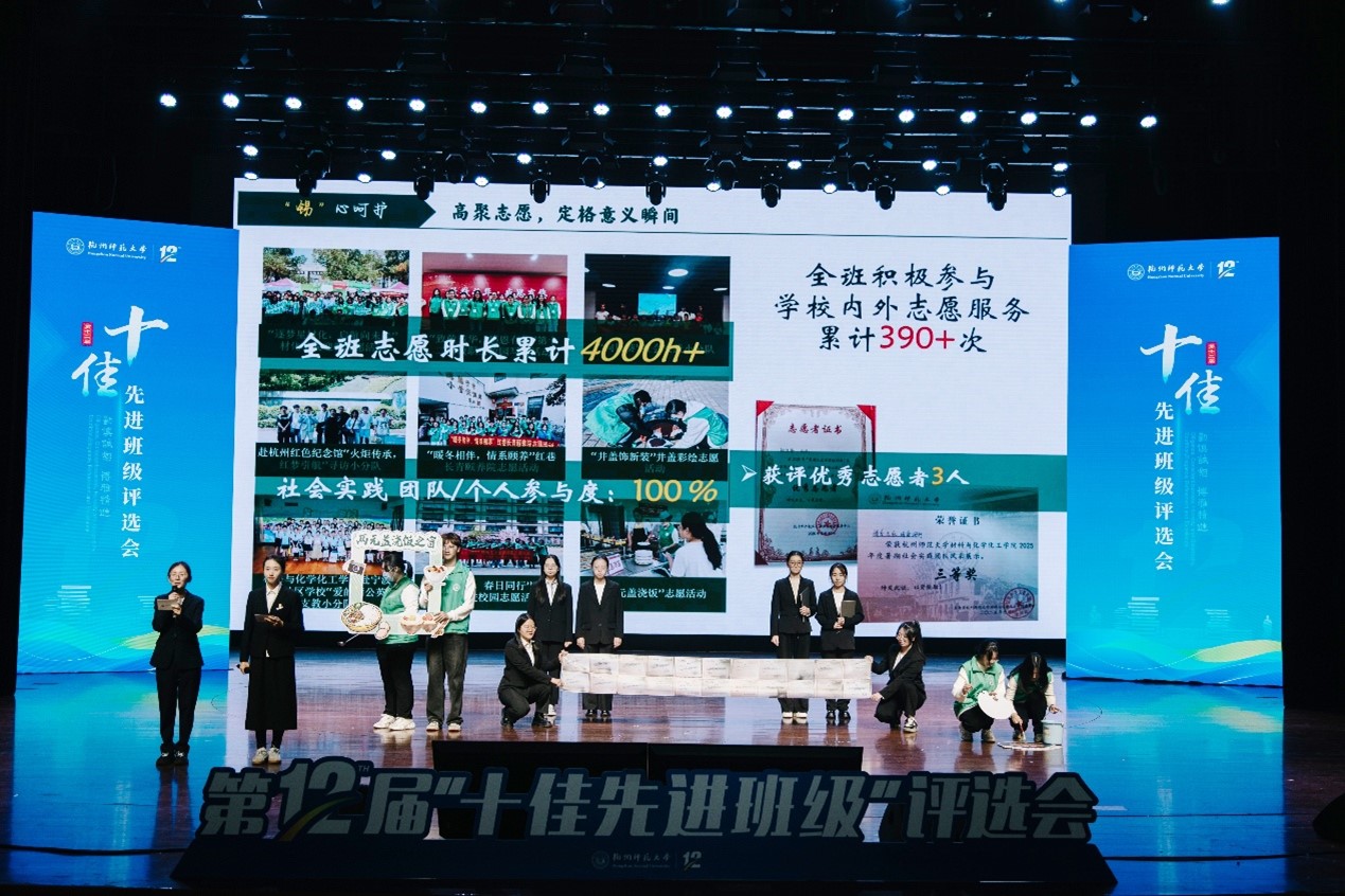 11月14日晚,第十二届jdb电子 十佳先进班级评选答辩在下沙校区艺术中心1200座举行。化学师范235班在班长刘苏婷,团支书蒋依辰,以及金雯姝、姜小帅、梅卓宁、谭韩峥等学生干部的带领下,经过现场答辩展示,荣获校“十佳先进班级”称号。