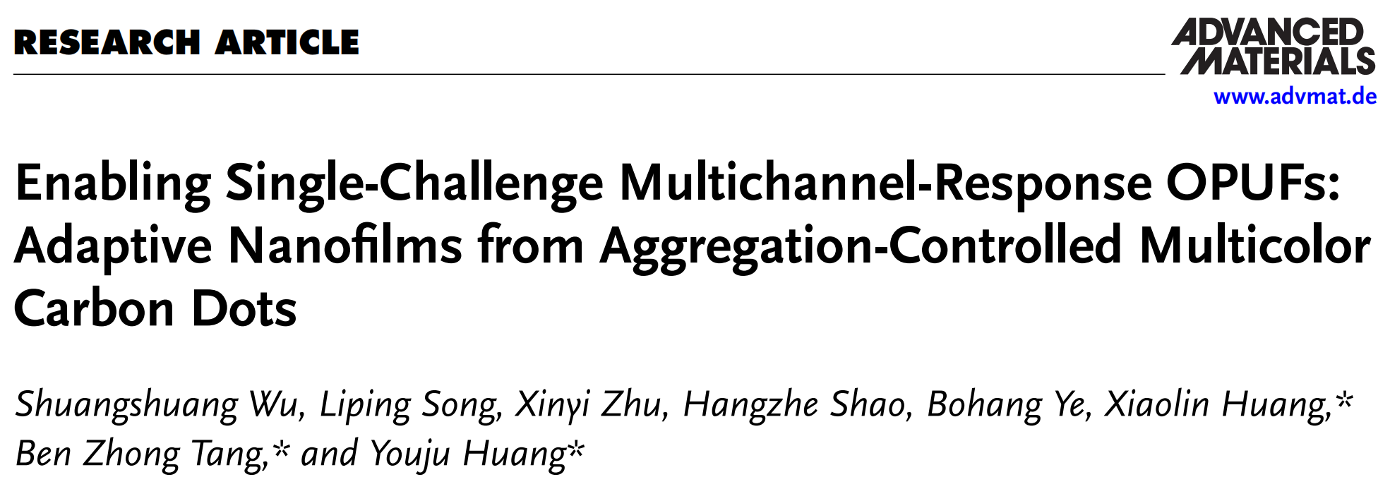 近日,jdb电子 黄又举教授团队利用多色聚集诱导发光(AIE)碳点在界面自组装构筑光学物理不可克隆功能(OPUFs)与多尺度防伪领域取得重要进展,相关研究工作以“Enabling Single-Challenge Multichannel-Response OPUFs: Adaptive Nanofilms from Aggregation-Controlled Multicolor Carbon Dots”为题发表在《Advanced Materials》(Q1,IF=29.4)上。DOI: 10.1002/adma.202519060。