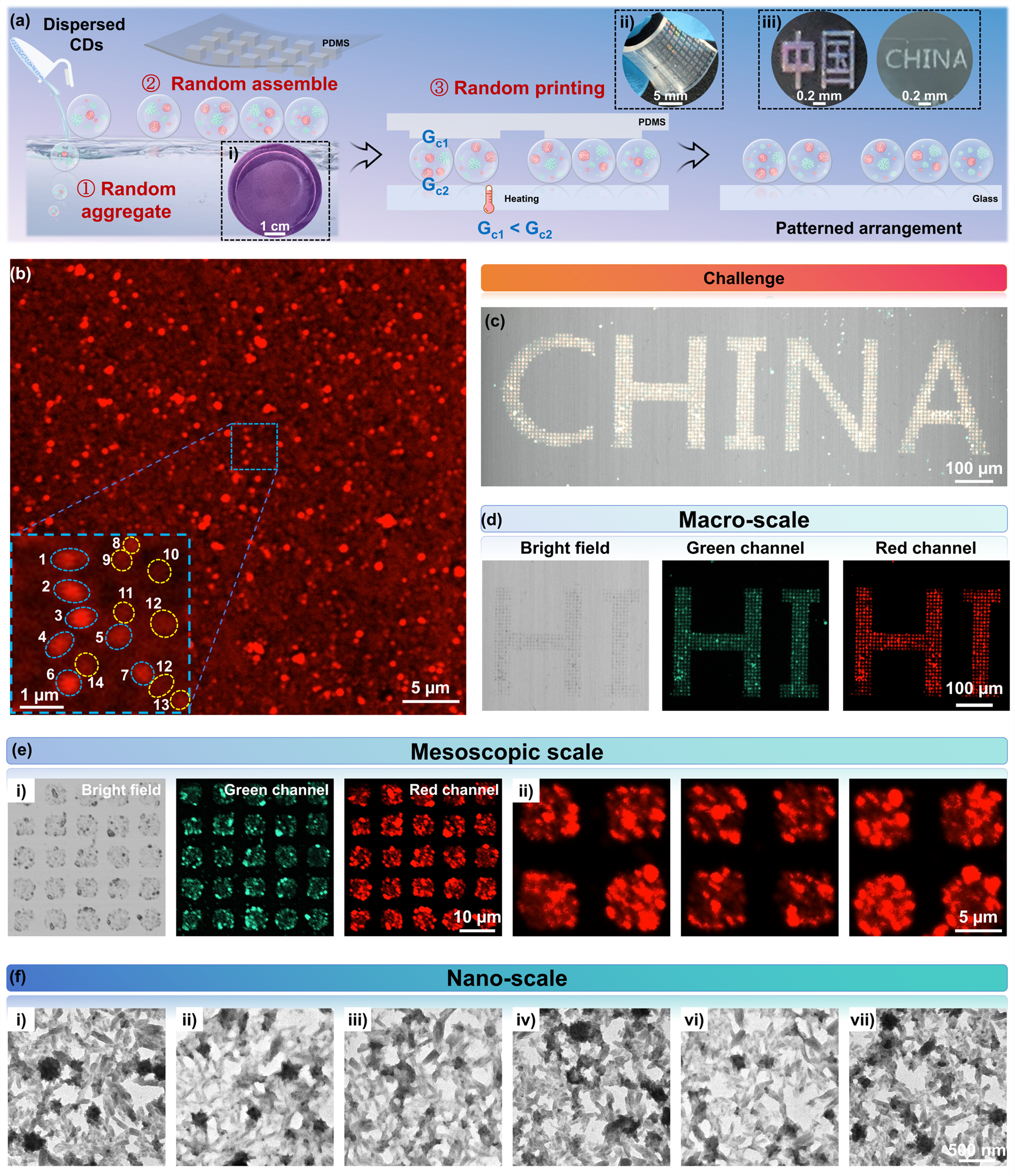 图3. 通过熵驱动组装和热辅助打印碳点纳米薄膜制备随机微纳图案。