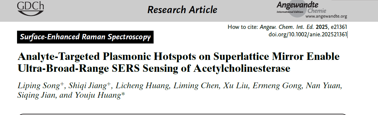 近日,jdb电子 黄又举教授在超分子主客体助力胶体粒子超晶格膜实现酶触发式SERS传感机制取得新进展。相关研究成果以“Analyte-Targeted Plasmonic Hotspots on Superlattice Mirror Enable Ultra-Broad-Range SERS Sensing of Acetylcholinesterase”为题,发表于Angewandte Chemie International Edition (Q1, IF=16.7), DOI: 10.1002/anie.202521361。